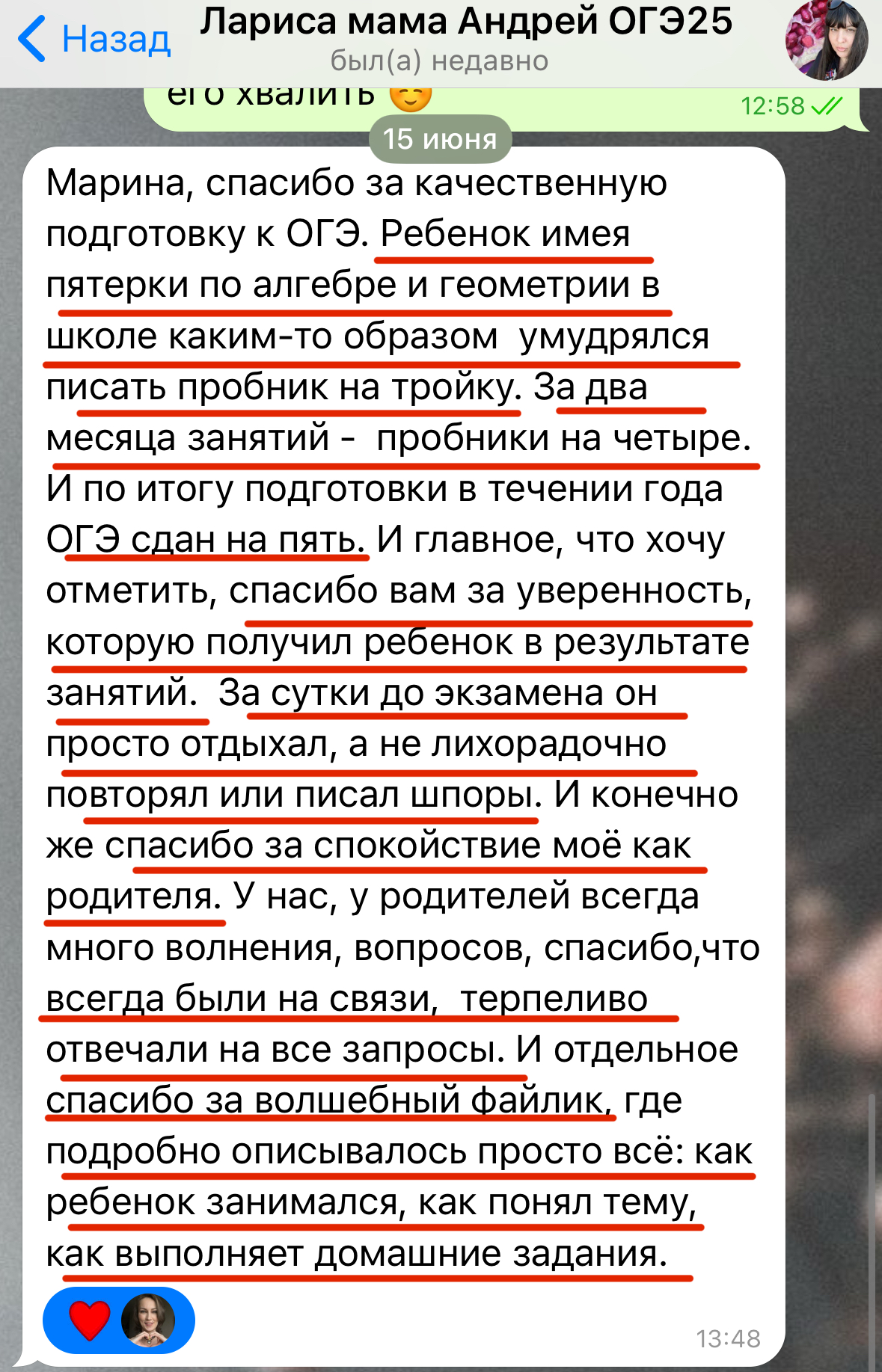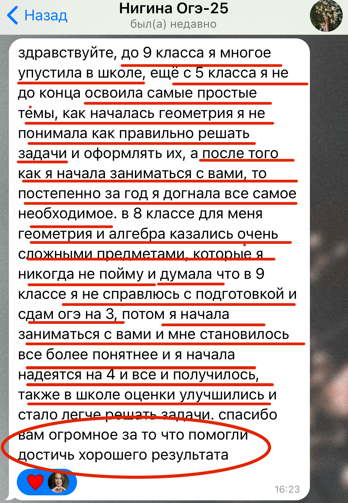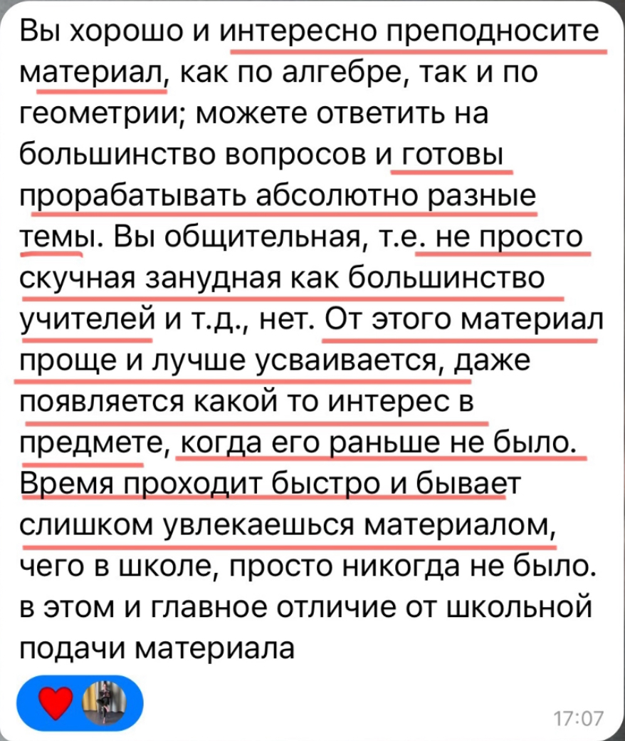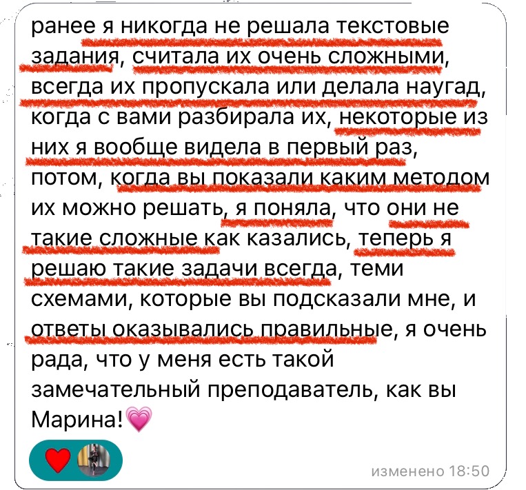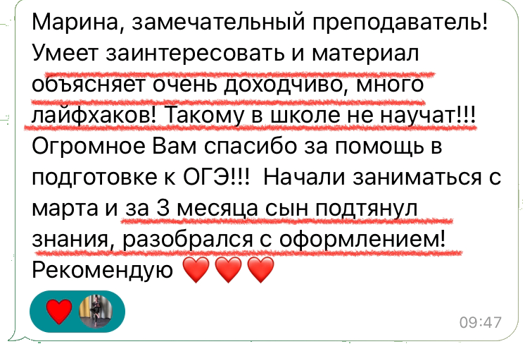 Каждый год повышаю квалификацию и улучшаю методику преподавания заданий 2 части ОГЭ и ЕГЭ, поэтому мои ученики знают все тонкости оформления и не теряют баллы на экзамене